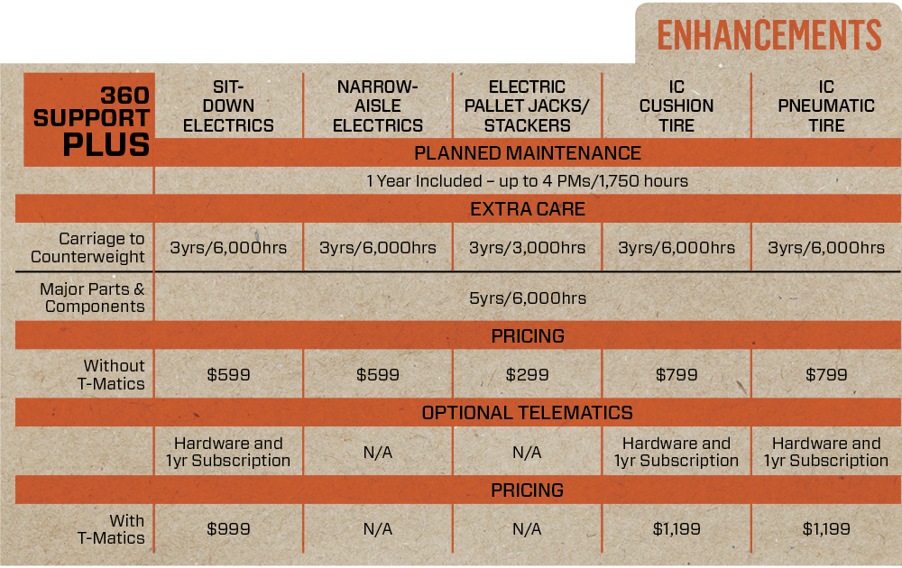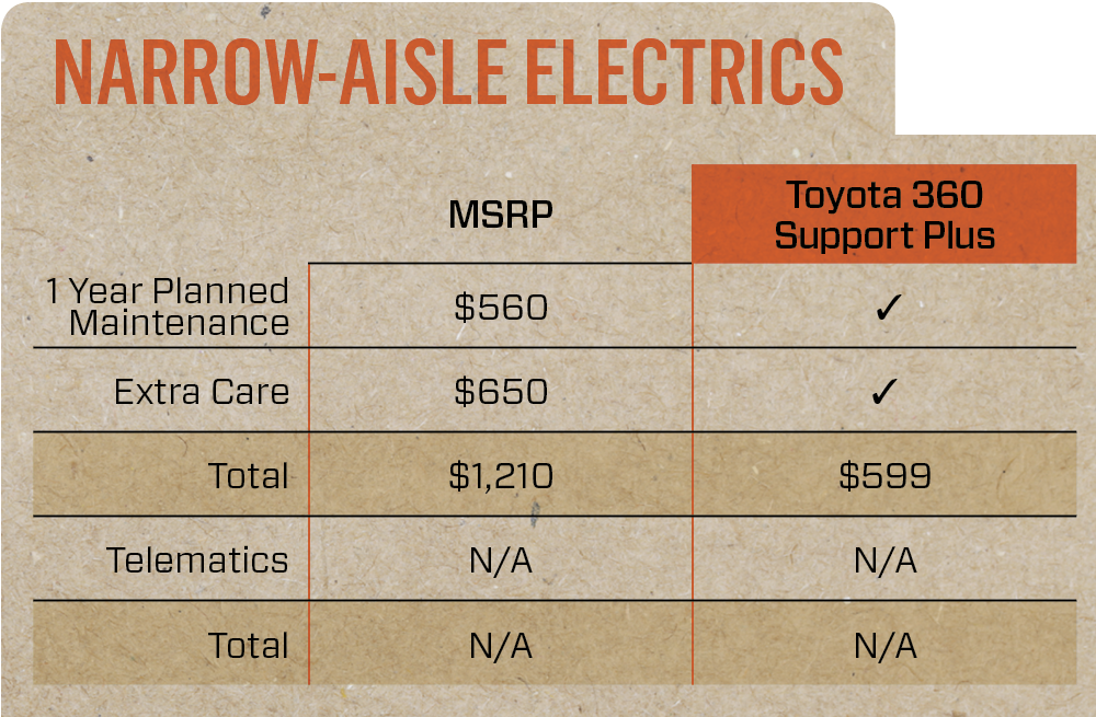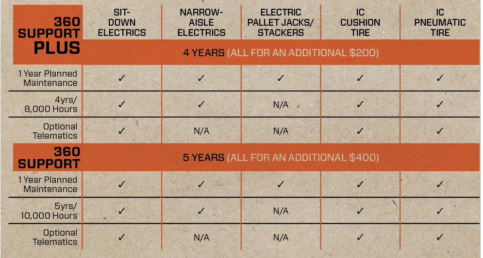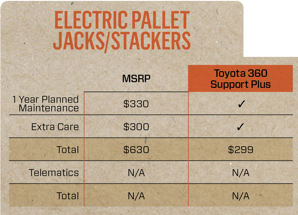 US & Canada ONLY. Prices are in US Dollars. Published Toyota 360 Support Plus pricing and availability applies to customer locations within 50 miles of a Toyota Forklift dealership. Additional travel charges may apply beyond 50 miles. Product availability is at dealer discretion beyond 50 miles from dealership. See dealer for details.